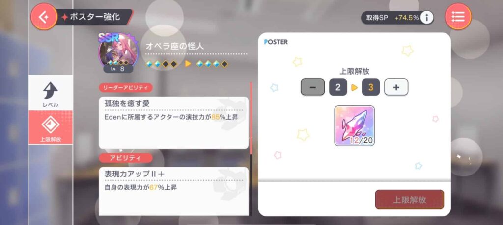 最大強化させたポスターは「上限解放」させることで、最大レベルが上昇してさらなるレベルアップが可能に。
